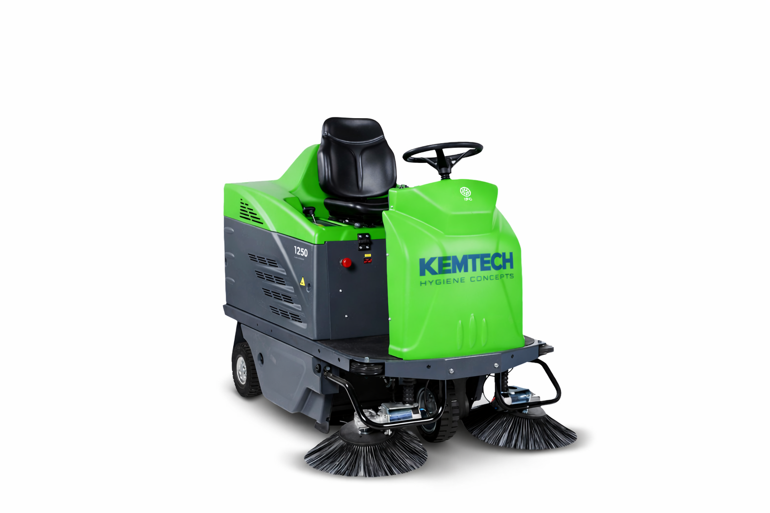 The 1250 ride-on sweeper is designed for versatile use across multiple sectors, including retail, construction, agriculture, and healthcare. It is available in three different versions to meet a wide range of cleaning requirements. The battery-powered model is ideal for indoor environments and medium to large surfaces, the hybrid petrol–battery version offers extended operating range, and the petrol engine model is perfectly suited for outdoor applications.